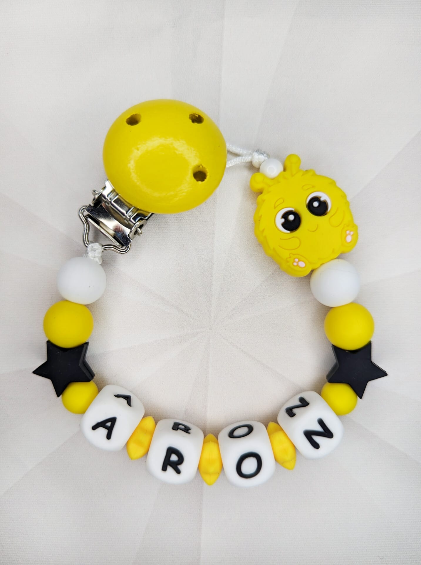 Palume arvestada, et mida pikem on lutiketile minev nimi, seda vähem ilupärleid saame lutiketi alguses ja lõpus kasutada. Vähem pärleid üldse mitte kadedusest, vaid seetõttu, et lutikett peab vastama standarditele, et olla beebile ohutu. Lutikettidele, mis sisaldavad rohkem kui 5 tähemärki, ei lisa me nimetähtede vahele tähti eraldavaid pärleid, kuna lutikett muutub muidu liiga pikaks ja lapsele ohtlikuks.