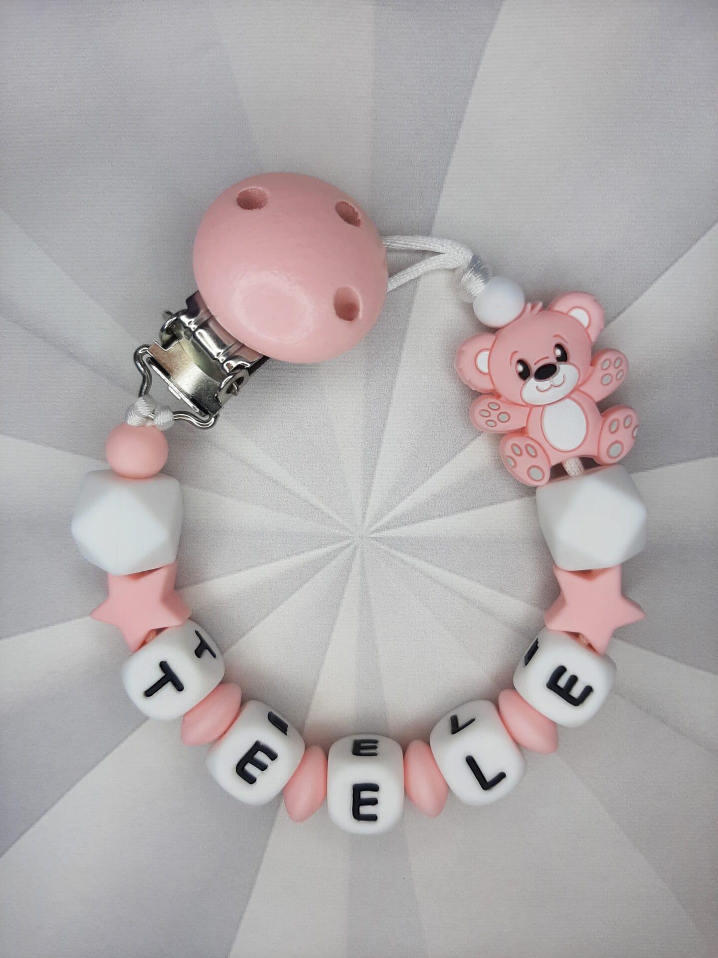 Palume arvestada, et mida pikem on lutiketile minev nimi, seda vähem ilupärleid saame lutiketi alguses ja lõpus kasutada. Vähem pärleid üldse mitte kadedusest, vaid seetõttu, et lutikett peab vastama standarditele, et olla beebile ohutu. Lutikettidele, mis sisaldavad rohkem kui 5 tähemärki, ei lisa me nimetähtede vahele tähti eraldavaid pärleid, kuna lutikett muutub muidu liiga pikaks ja lapsele ohtlikuks.